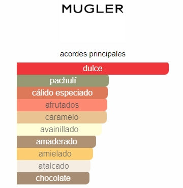 Angel de Mugler es una fragancia de la familia olfativa Ámbar Vainilla lanzada en 1992. Fue creada por Olivier Cresp y Yves de Chirin. Las Notas de Salida son algodón de azúcar, coco, casis (grosellero negro), melón, jazmín, bergamota, piña y mandarina; las Notas de Corazón son miel, bayas rojas, zarzamora (frambuesa negra), ciruela, chabacano, durazno (melocotón), jazmín, orquídea, alcaravea, nuez moscada, rosa y lirio de los valles (muguete); las Notas de Fondo son pachulí, chocolate, caramelo, vainilla, haba tonka, ámbar, almizcle y sándalo.