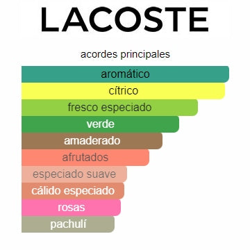 Essential de Lacoste Fragrances es una fragancia de la familia olfativa Amaderada Aromática para Hombres; se lanzó en 2005 y la Nariz detrás de esta fragancia es Laurent Bruyere. Las Notas de Salida son bergamota, casia, hojas de tomatera y naranja tangerina; las Notas de Corazón son rosa y pimienta; las Notas de Fondo son pachulí y sándalo.