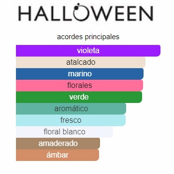 Halloween de J. Del Pozo es una fragancia de la familia olfativa Ámbar Floral para Mujeres, se lanzó en 1997. y la nariz detrás de esta fragancia es Max Gavarry. Las Notas de Salida son violeta, notas marinas, hoja de plátano y petit grain; las Notas de Corazón son violeta, magnolia, lirio de los valles (muguete), nardos y pimienta; las Notas de Fondo son incienso, sándalo, vainilla de Madagascar y mirra.
