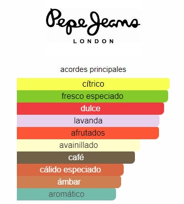 Pepe Jeans for Him de Pepe Jeans London es una fragancia de la familia olfativa Aromática Frutal para Hombres. Pepe Jeans for Him se lanzó en 2018. La Nariz detrás de esta fragrancia es Jérôme di Marino. Las Notas de Salida son piña, mandarina y bergamota; las Notas de Corazón son lavanda y nuez moscada; las Notas de Fondo son vainilla, granos de café tostado y Amberwood.